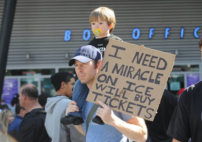 Sollte eine Einigung erst später erfolgen, sähe die Saison folgendermaßen aus. Rund 70 Spiele fänden statt, wenn ab 1. Dezember gespielt würde, rund 55, wenn ab 1. Januar gespielt würde und etwas über 40 ab 1. Februar. 1994/95 endete der Lockout am 11. Januar. Ab Ende Januar trugen die damals 26 Teams noch je 48 Spiele aus. Wie auf unserem Bild hoffen vor allem die Fans endlich auf das "Miracle on Ice", das vor allem in den sturmgeplagten Staaten New York und New Jersey aber nicht unbedingt vom Himmel regnen soll.