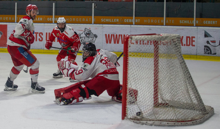 Vorbei an Goalie Ansgar Preuß trifft Regensburgs Lukas Heger (rotes Trikot) zum vorentscheidenden 6:4 für seine Mannschaft.