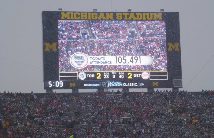 Wie die NHL verkündet hatte, waren für das Neujahrsspiel zwischen den Toronto Maple Leafs und den Detroit Red Wings 105.491 Tickets verkauft worden. Somit wäre der alte Rekord von 104.173 Zuschauern aus dem Jahr 2010 (Collegespiel zwischen Michigan State und University of Michigan) eigentlich gebrochen gewesen. Doch wegen des kalten Winterwetters mit teils heftigem Schneefall erreichten viele Zuschauer das Michigan Stadion am 1. Januar dieses Jahres erst während des zweiten Drittels. Problem dabei war, dass die Ticketscanner zu diesem Zeitpunkt nicht mehr in Betrieb waren, da auch sie dem schlechten Wetter zum Opfer fielen. Die Zuschauer, die zu spät kamen, flossen somit nicht mehr in die offizielle Zählung mit ein und der alte Rekord der University of Michigan bleibt bestehen.
