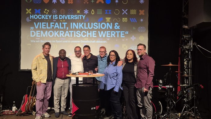 Zu den Teilnehmerinnen und Teilnehmern der beeindruckenden Diskussionsrunde, die selbst oder deren Familienmitglieder eine Migrationsgeschichte haben, gehörten auch Alexis Kamewe von Hockey is Diversity und Mitglied des Integrationsrats der Stadt Alsdorf bei Aachen, Marion Vanderweerd Kohl, die erste farbige Spielerin der deutschen Frauen-Nationalmannschaft, Matthias Hafermann, Mitglied der Band Culcha Candela, die in einigen ihrer Songs Haltung gegen Diskriminierung und Rassismus zeigt, Stefan Geister, Gründer der Organisation „Vereinity e.V.“, die sich dafür einsetzt, dass in Vereinsstatuten Paragrafen verankert werden, die den Mitgliedern freie Meinungsäußerung gewähren, solange dies nicht auf Kosten anderer Menschen geht, sowie Said Hakim, Chef von ISS Ice in Frankfurt.