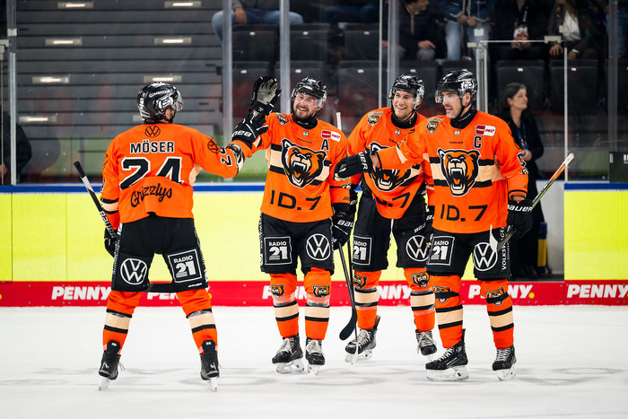 Die Grizzlys Wolfsburg sind die Tor-Maschine der Liga. Fabio Pfohl (Zweiter von links) punktete am Freitag vierfach.