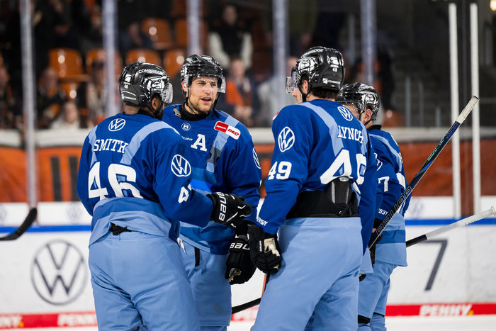 Ungewohntes Bild: Die Grizzlys Wolfsburg – ganz in blau – siegten beim Trainerdebüt von Tyler Haskins mit 4:1 gegen Ingolstadt.